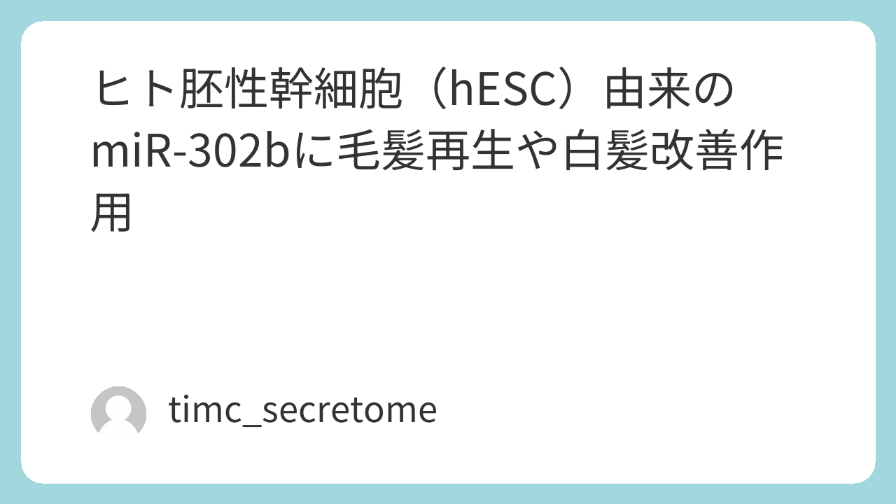 【ヒト胚性幹細胞(hESC)由来のmiR-302bに毛髪再生や白髪改善作用】ヒト胚性幹細胞(hESC)由来のエクソソームに含まれるマイクロRNAのmiR-302bには、老化した細胞の若返りを促す働きがあります。細胞周期を停止させる因子を抑制することで、老化細胞の増殖能力を回復させることが報告されています。薄毛や白髪に有効です。毛髪の成長に不可欠な毛包幹細胞の活性化に、miR-302bが間接的に寄与します。